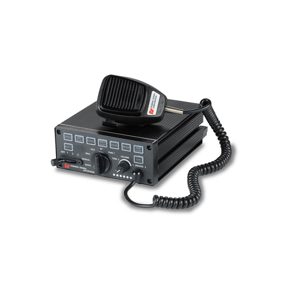The Federal Signal Pathfinder Siren & Light Controller is a compact, programmable siren and light controller with self-contained controls. The Pathfinder is packed with features such as dual-tone and integratable Rumbler intersection clearing capability along with optional Federal Signal Vehicle Integration/On-Board Diagnostics (OBDII) integration. The Pathfinder is easy to install and incorporates Convergence Network Configuration Software to provide a high-level of customizable control capability. All new programming software is available as a download from the Federal Signal website making it easy to program one vehicle – or an entire fleet – from your laptop. Pathfinder provides the user with customized control of the siren, warning lights, directional lights, and other accessories. The control faceplate includes a four-position progressive slide switch, seven-position rotary switch and (9) backlit push-buttons. The dual color programmable push-buttons turn brighter when activated and can be programmed for press-on, press-off and momentary. The button brightness can be dimmed or turned-off for stealth operation. Over (100) labeling stickers, such as alley, gun lock and wail allow for further customization of the control head. Pathfinder can control the SignalMaster directional functions in light bars, ILS systems and 'stick' lights that are compatible with FS Convergence Network as well as Latitude 3-wire SignalMaster. For convenient visual reference, the Pathfinder emulates the selected pattern of the SignalMaster operation. Pathfinder also includes (2) programmable speaker diagnostic LEDs on the faceplate that default to Off when speakers are enabled. Pathfinder default siren tones include Wail, Yelp, Priority, Manual/Peak-and-Hold, Hi-Lo, Powercall, and Air Horn. A library of other selectable siren tones are available including Unitrol branded siren tones such as Wail, Yelp, Futura, Hi-Lo, Ultra Hi-Lo, Alarm, Air Horn, and Hetro. PA, radio rebroadcast, and Air Horn is standard in the Pathfinder. Pathfinder also includes (2) serial ports to be used with the FS Convergence Network devices such as light bars or directional warning lights for easy 'plug-n-play' installation. Other amplifier features include horn ring transfer (TAPII, Timer or Hands-Free), Park, Ignition, and (4) general purpose inputs for trunk/door release, gun lock, intrusion alarms and monitoring K9 temperature systems. The polarity of each input is programmable except for ignition.