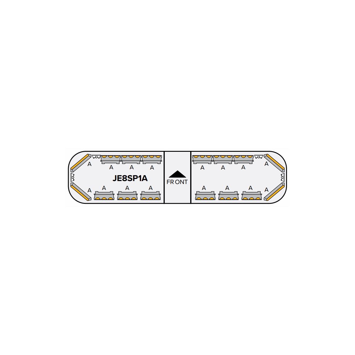 Justice JE Series, 4 Amber Corners and 11 or 12 Inboard Amber Modules (6 Front/6 Rear, or 6 Front/ 5 Rear w/ Traffic Advisor). They are backed by a Whelen five year warranty.